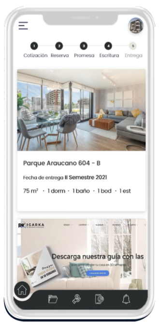 Una vez que hayas firmado tu promesa de compraventa, podrás descargar nuestra App desde tu App Store o Google Play, crea tu usuario utilizando tu rut y el correo que registraste al momento de la cotización. Una vez creado el usuario podrás acceder a las diferentes informaciones relacionadas con tu compra como por ejemplo la planta de tu departamento, las fotografías de los pilotos, el avance de obra, etc. También podrás pagar tu pie a través de la App e incluso contactarte con tu ejecutiva de ventas, servicio al cliente o el jefe de ventas.